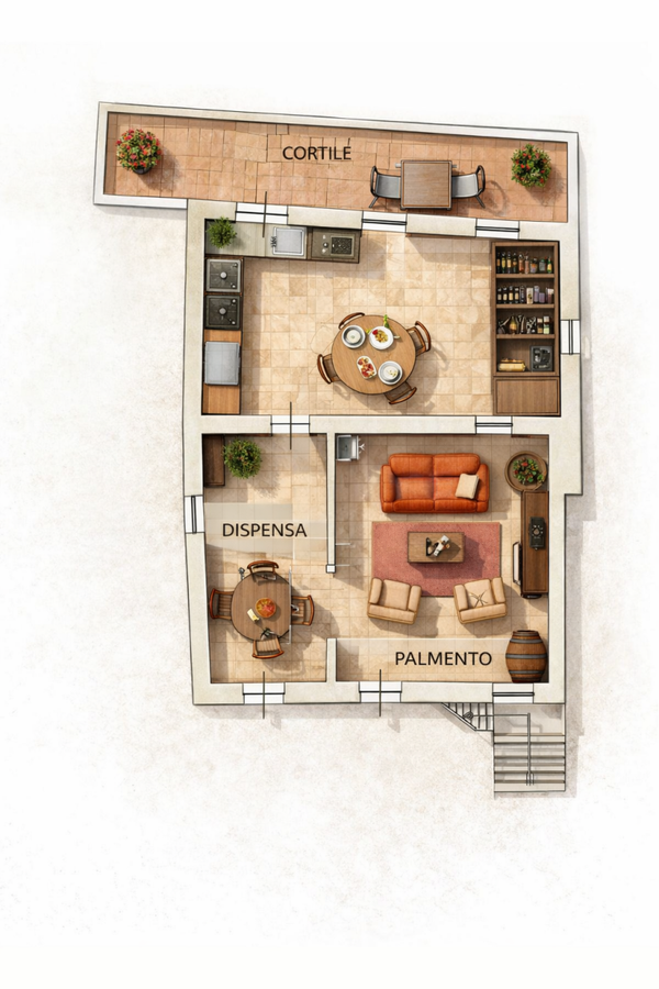 Piano Terra: I locali originariamente destinati alla vinificazione (palmento), caratterizzati da ampi volumi e dettagli d'epoca.